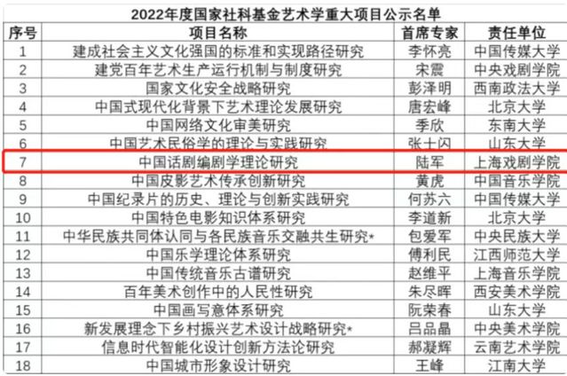日前,2022年度国家社科基金艺术学重大项目正式公示,上海市文史研究馆馆员、校学术委员会主任、我系陆军教授领衔申报的课题《中国话剧编剧学理论研究》获得立项。