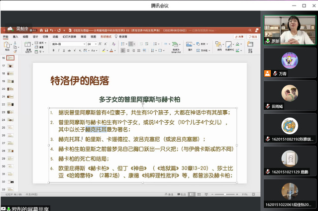 罗彤老师先为我们从史实和神话两方面都介绍了一下有关特洛伊战争的背景,包括时间、地图、战争经过、重要故事、涉及人物等。自此,崇尚武力的男权世界走进了舞台的中央。神话特洛伊战争虽然是一场男性之间的战争,但是这场战争的起源,造成的后果,以及之后的后延,却都与女性相关。罗彤老师以表格的形式为我们梳理了有关特洛伊战争的人物。特洛伊战争之后,阿伽门农凯旋而来,却被妻子所杀,而后妻子又被自己的儿子毒杀,最后在雅典娜的支持下得到了宽恕,表示着父权战胜了母权。