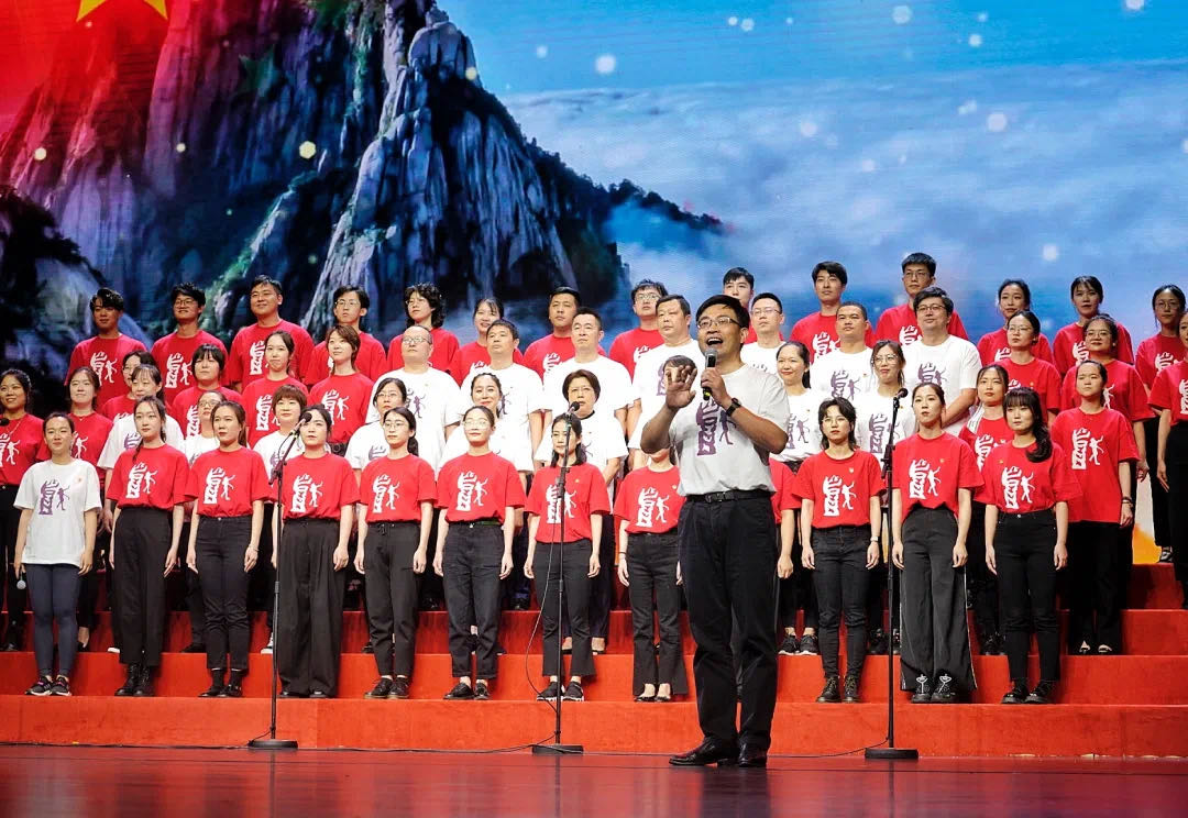 戏剧文学系党支部师生积极参与,在表现社会主义建设伟大成就的第二篇章中,共同歌唱《革命人永远是年轻》。整齐的队伍和服装代表了戏文系师生的团结统一,更象征了“革命人”好比松树挺立山顶的质朴与踏实。嘹亮的歌声与声情并茂的朗诵相得益彰,唱出了革命者的激情与豪迈、坚定与执着,诵出了“革命人”不畏艰险与牺牲的精神,更体现了戏文系师生凝心聚力、共同前进的精神风貌。