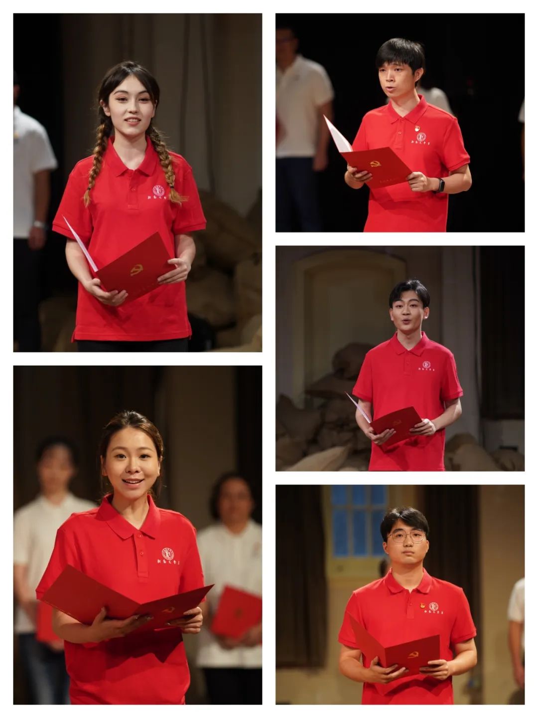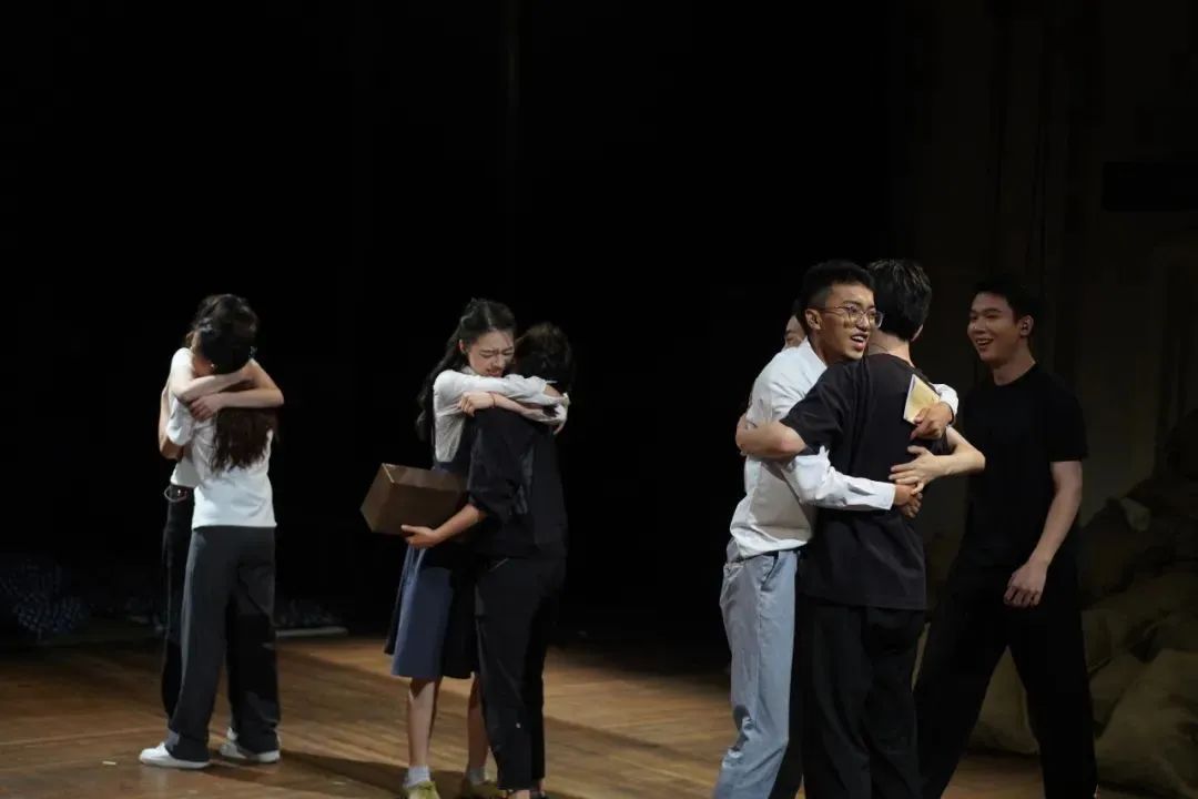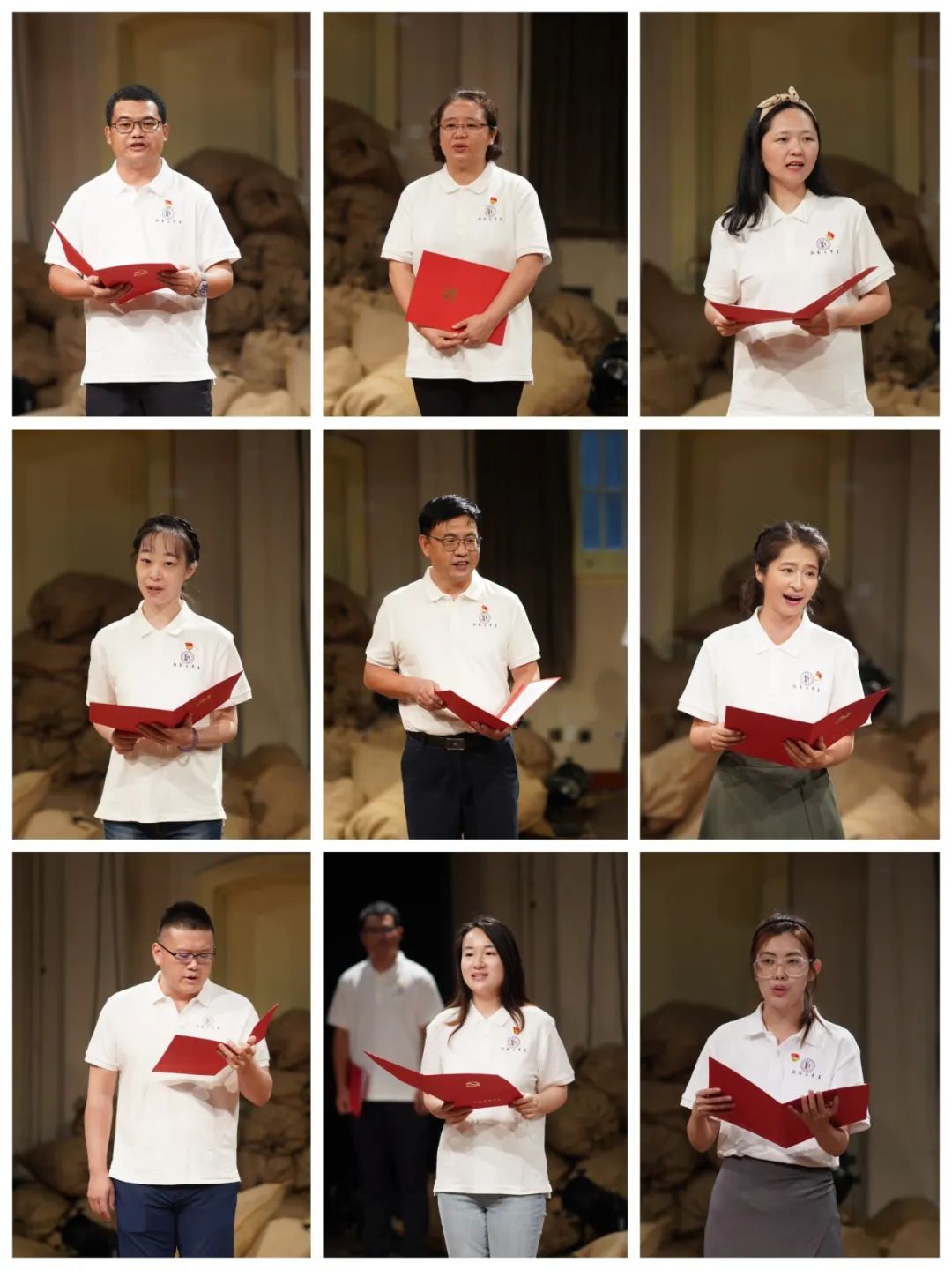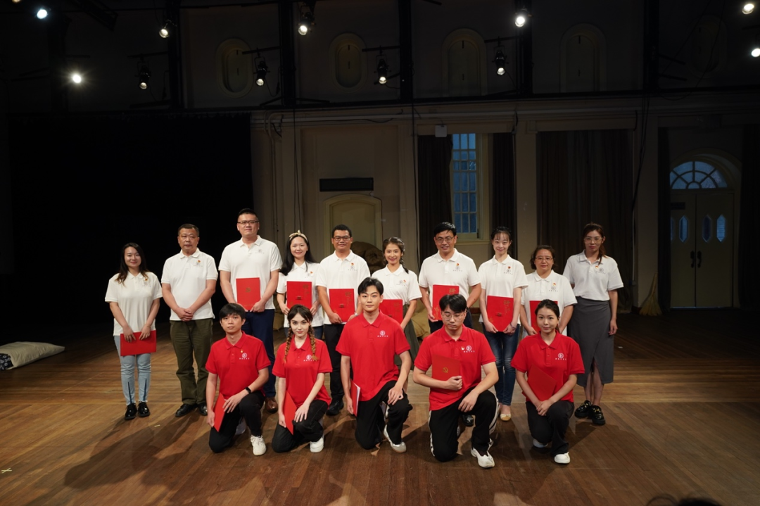 演出末尾,炮火声渐渐隐去,戏文系副主任李世涛、戏文系教师党支部书记朱锦华等14位戏文系师生代表迎着“曙光”依次登台,结合自身专业讲述了他们眼中的教育家精神,表达了身为新一代上戏人的骄傲与担当,共同完成了一场党员教师代表与教师入党积极分子、学生党员代表两两结对、薪火相传的传承仪式。戏文系党总支支委、系副主任徐煜为党员导师代表颁发了聘书。