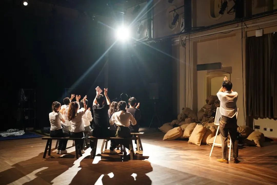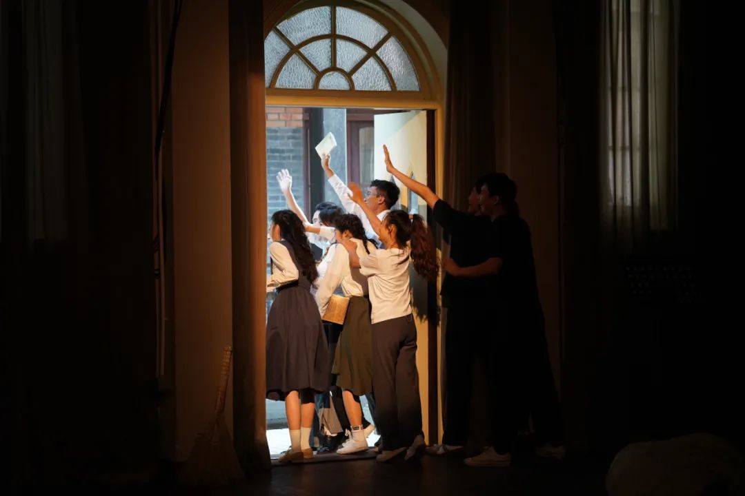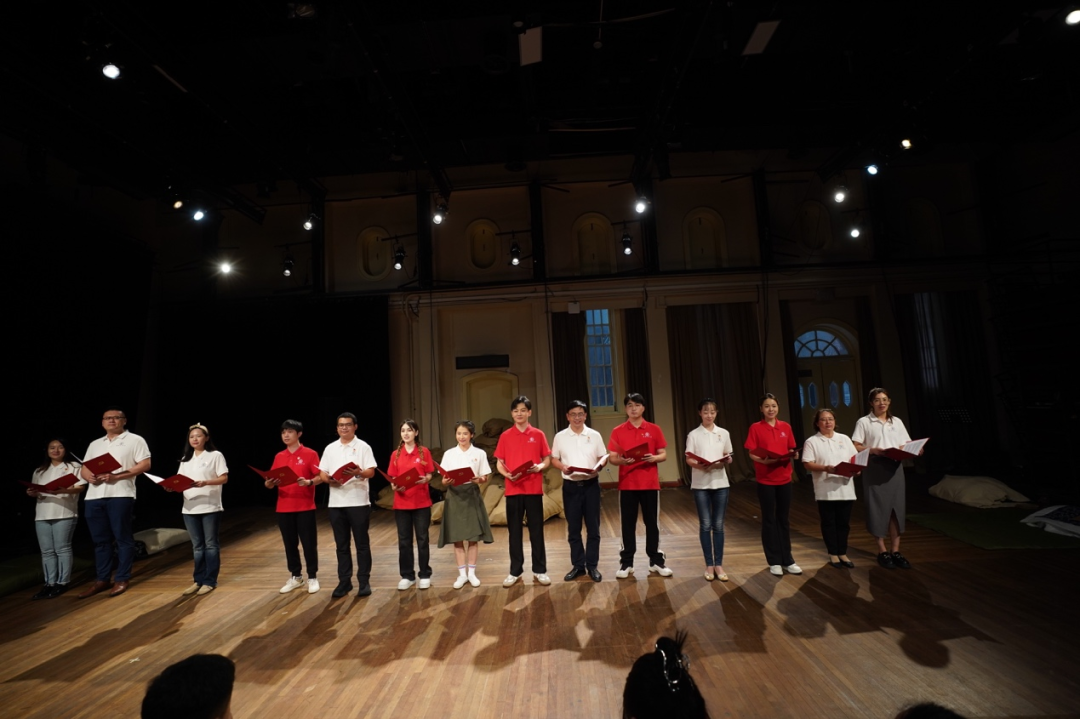 活动从一场科艺融合的创意演出——沉浸式声音剧场《曙光里的上戏》徐徐展开。该剧以75年前上海解放前夕,上戏师生在中共地下组织的领导下,在如今的华山路校区新空间所在地曾组织的一场“台尔蒙行动”这段红色校史为素材,以“声音”为媒,引导观众从“用眼睛看”转向“用耳朵看”,更用AI技术还原熊佛西校长声音作为特别讲述者。通过跨学科跨领域合作,在历史现场以文献剧式的历史声景演绎历史事件,身临其境般再现了上戏先贤们在艰难时局下以信念为支撑、以勤学为行动,“护校、储粮、迎解放”,最终攻坚克难,迎来解放曙光。多线性声道的编排激发观众能动性,形成“身未动,听先动”的交互模式,为新型演艺空间及科艺融合背景下的戏剧创作提供新思路。在戏剧文学系党总支的精心策划组织下,该剧汇聚了戏剧文学系、电影学院、舞台美术系、舞蹈学院等众多院系、不同专业领域的骨干教师和优秀研究生、本科生,联合展示专业成果的同时,致敬了前辈先师们“心有大我、至诚报国”“言为士则、行为世范”的教育家精神。