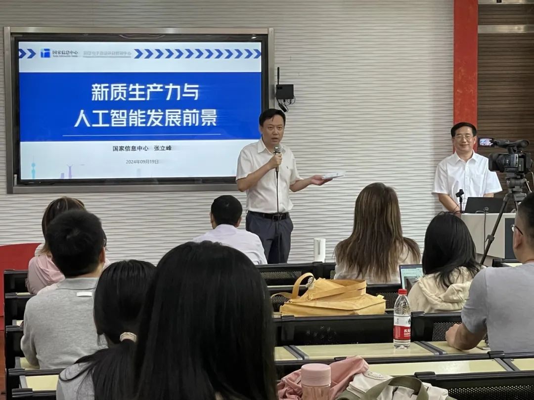 2024年9月19日下午,开云足球首页官网下载戏剧文学系的“AI与艺术”系列讲座第一讲《新质生产力与人工智能发展前景》于红楼209教室举行。本次讲座有幸邀请到国家信息中心公共技术服务部副主任张立峰作为主讲嘉宾。戏剧文学系主任陈军教授和戏剧学专业主任黄静枫教授以及戏文系师生代表们共同参加了此次讲座。讲座由戏剧文学系易杰副教授主持。