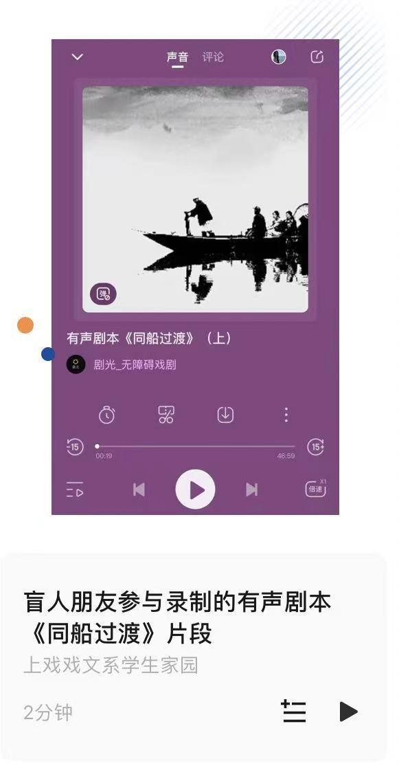 团队目前已获得一台好戏文化传媒有限公司的音乐剧《献给阿尔吉侬的花束》和《阿波罗尼亚》的版权授权,完成国内首部音乐剧有声书的录制与上传,通过与上海市残联的合作,有十余位残障人士深度参与到有声书的录制中。《上海屋檐下》《同船过渡》两部话剧的录制及上传也已完成,受到残障朋友的一致好评。