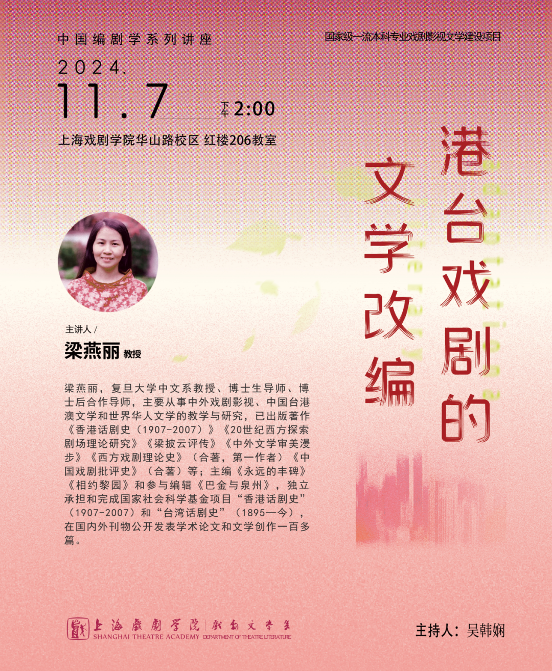 11月7日下午,复旦大学中文系教授、博士生导师、博士后合作导师梁燕丽教授应邀来我系开设《港台戏剧的文学改编》主题讲座,受到戏文系众师生的热烈欢迎。本次讲座由戏文系教师吴韩娴老师主持。