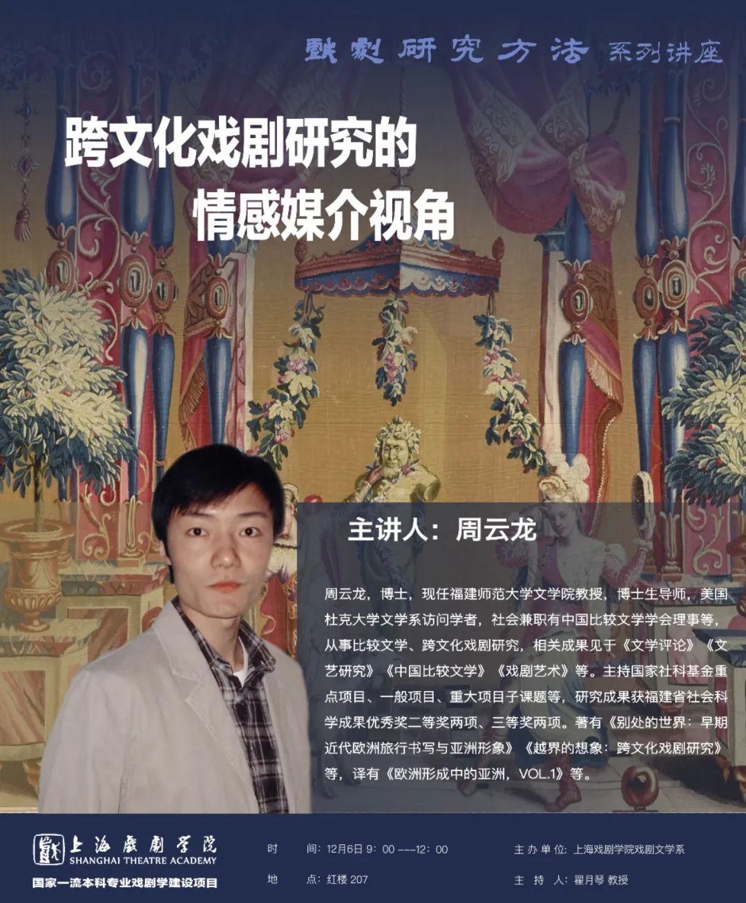 博士,现任福建师范大学文学院教授,博士生导师,美国杜克大学文学系访问学者,社会兼职有中国比较文学学会理事等,从事比较文学、跨文化戏剧研究,相关成果见于《文学评论》《文艺研究》《中国比较文学》《戏剧艺术》等。主持国家社科基金重点项目、一般项目、重大项目子课题等,研究成果获福建省社会科学成果优秀奖二等奖两项、三等奖两项。著有《别处的世界:早期近代欧洲旅行书写与亚洲形象》《越界的想象:跨文化戏剧研究》等,译有《欧洲形成中的亚洲,VOL.1》等。