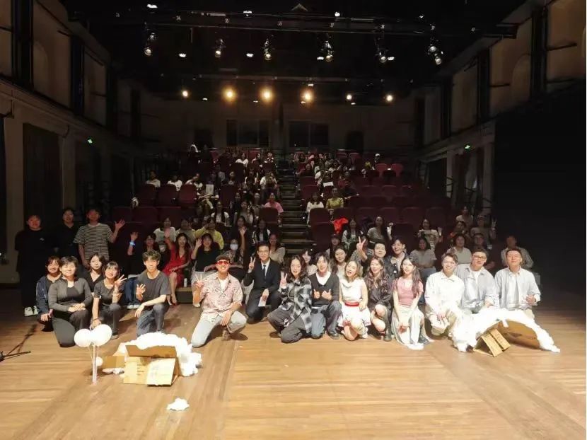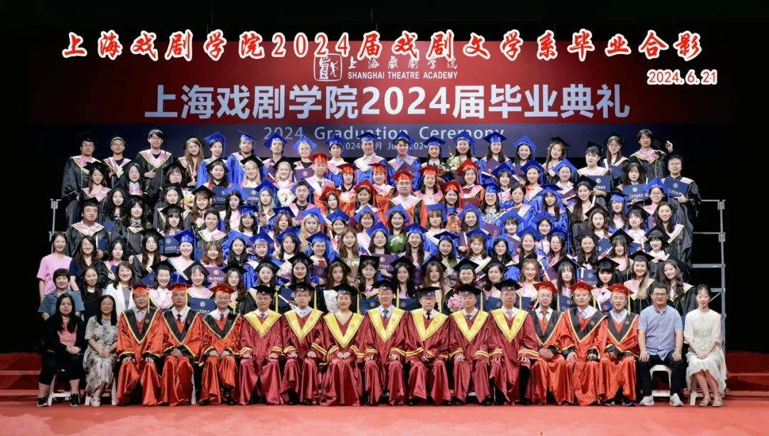 6月21日,2024届戏文系毕业生在上戏实验剧院与师长们合影留念。