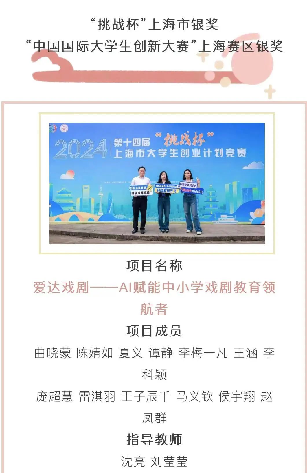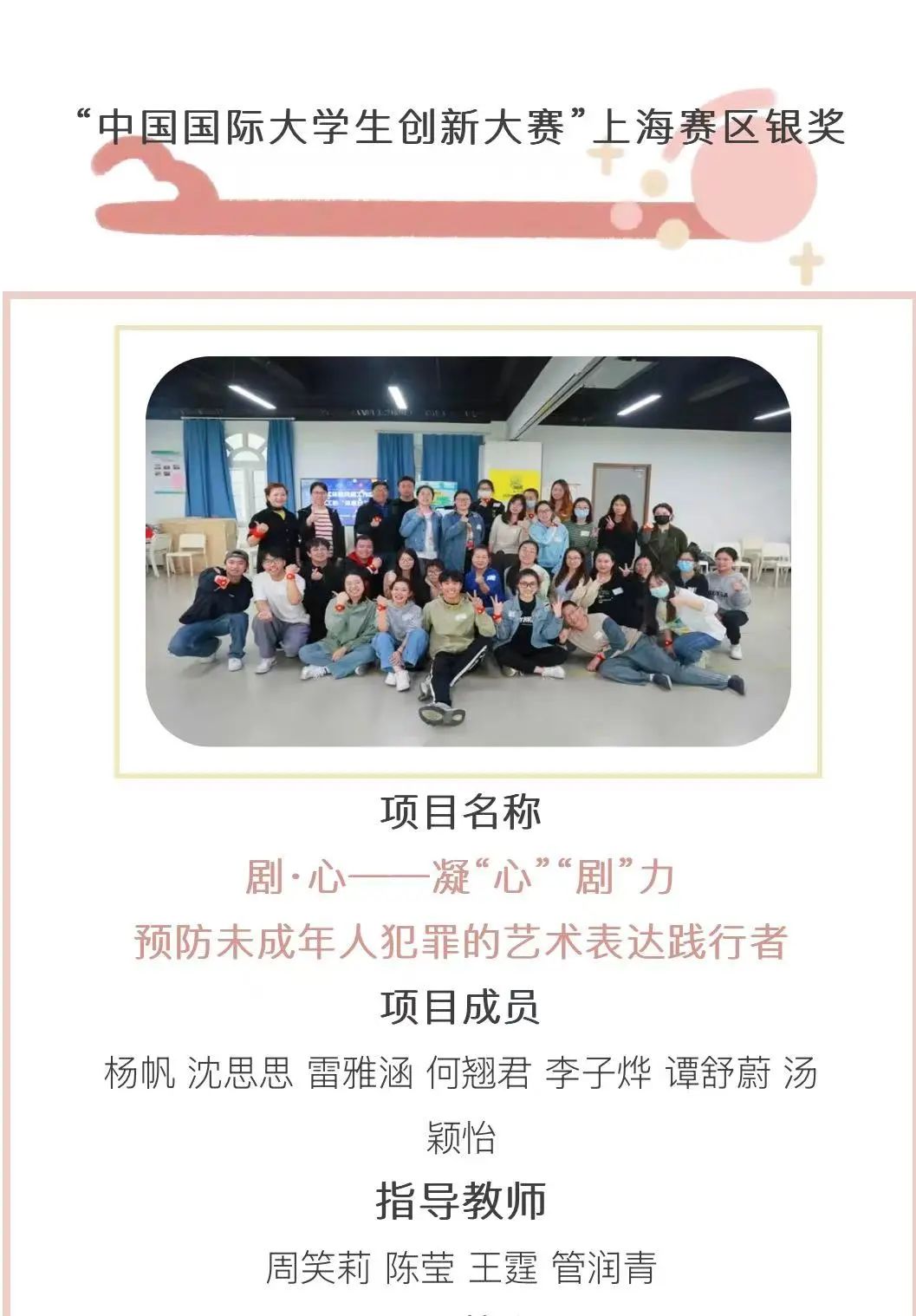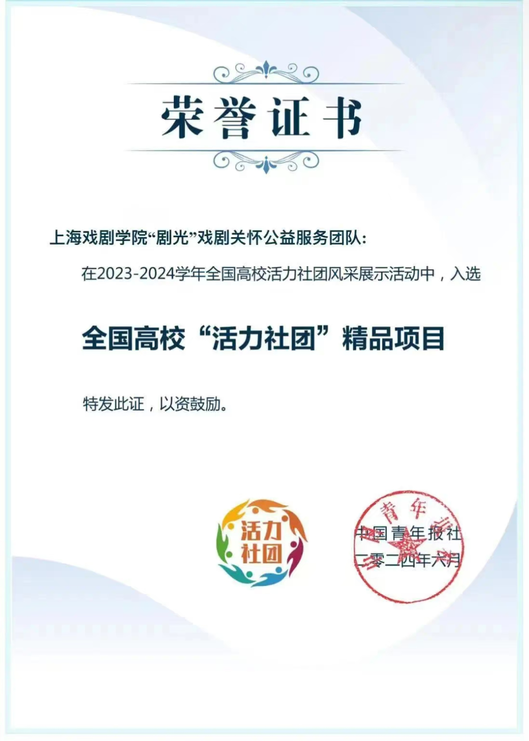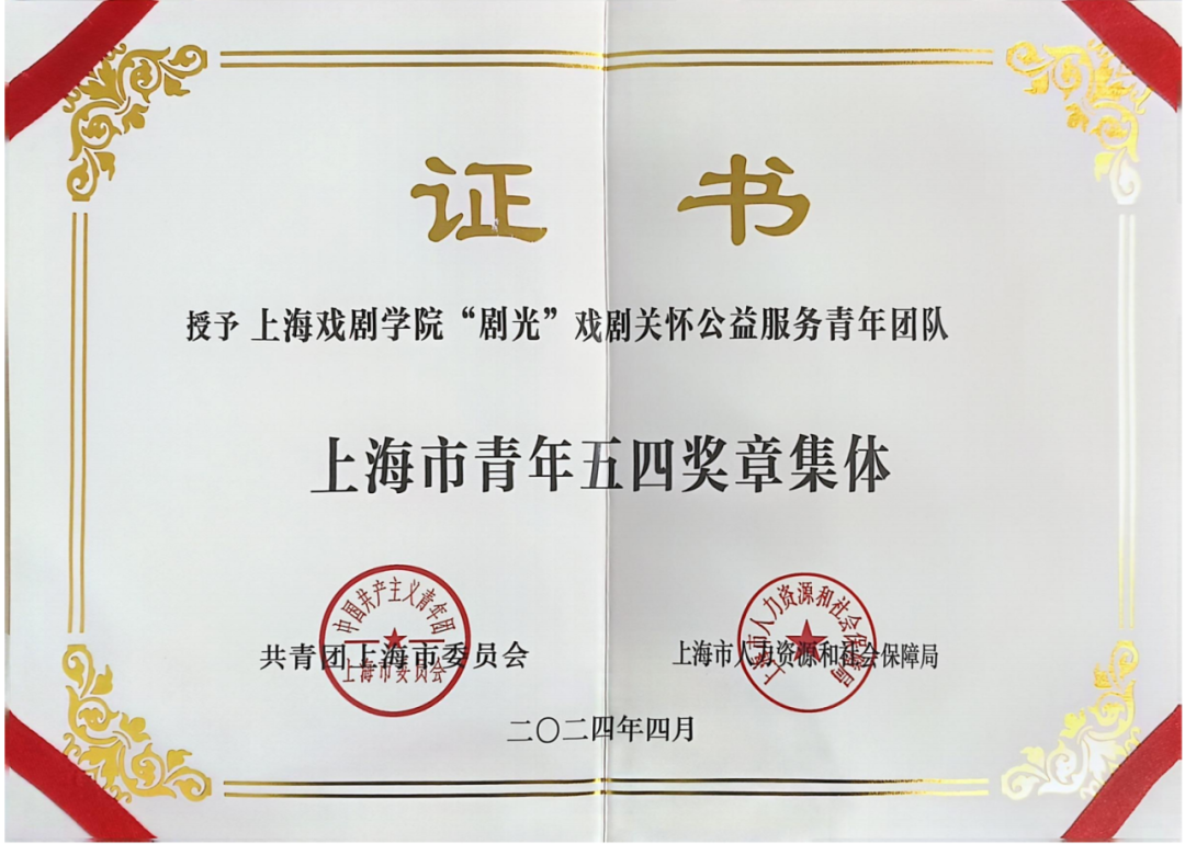 “剧光”戏剧关怀公益服务团队获上海市青年五四奖章集体、全国高校“活力社团”精品项目,“剧·心”戏剧普法与教育矫治服务团队获“年度十大公益创意”。
