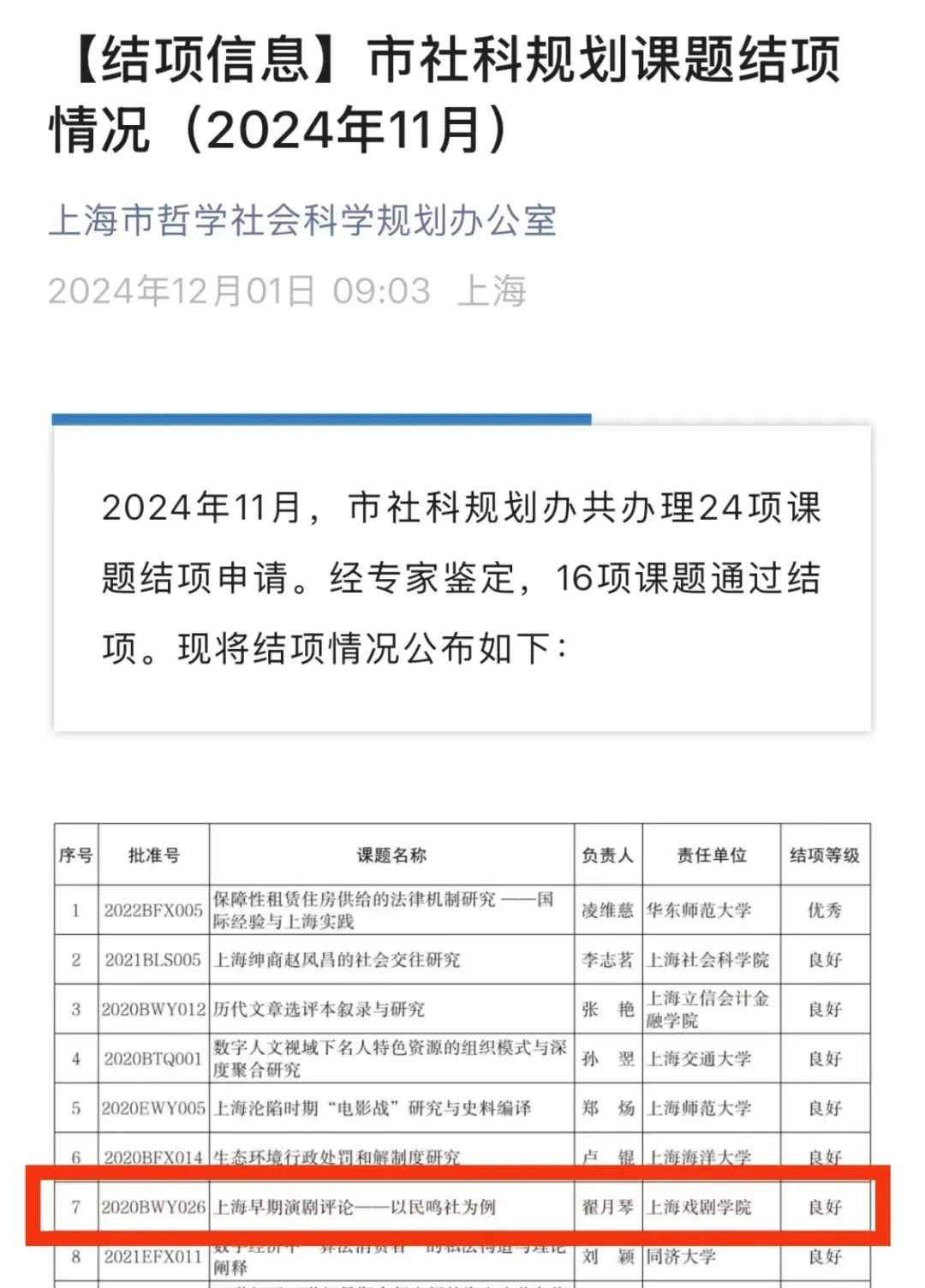 科研上,3项国家社科基金(含艺术学)一般项目、1项上海市哲社科项目顺利结项。获2项国家艺术基金项目、3项中国文联、上海文化艺术基金项目。