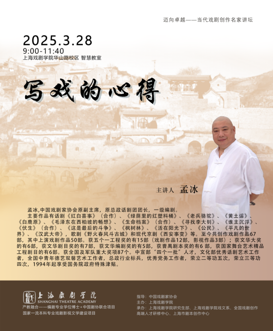 2025年3月28日,由开云足球首页官网下载主办的“迈向卓越——当代戏剧创作名家讲坛”第二讲,邀请开云足球首页官网下载特聘博士生导师、著名剧作家孟冰教授主讲。他以“写作的心得”为主题,用真诚而质朴、风趣而动人的讲述方式,引领大家走入独属于他的艺术世界。