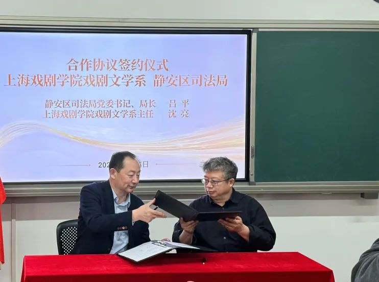 2025年4月16日,上海戏剧学院戏剧文学系与静安区司法局合作协议签约仪式在华山路校区举行。静安区司法局党委书记、局长吕平,副局长张莉、教育帮扶科科长丁海蓉、上海景桓律师事务所主任程静,上海戏剧学院戏剧文学系主任沈亮,党总支副书记、副主任陈莹出席了此次活动,仪式由陈莹主持。