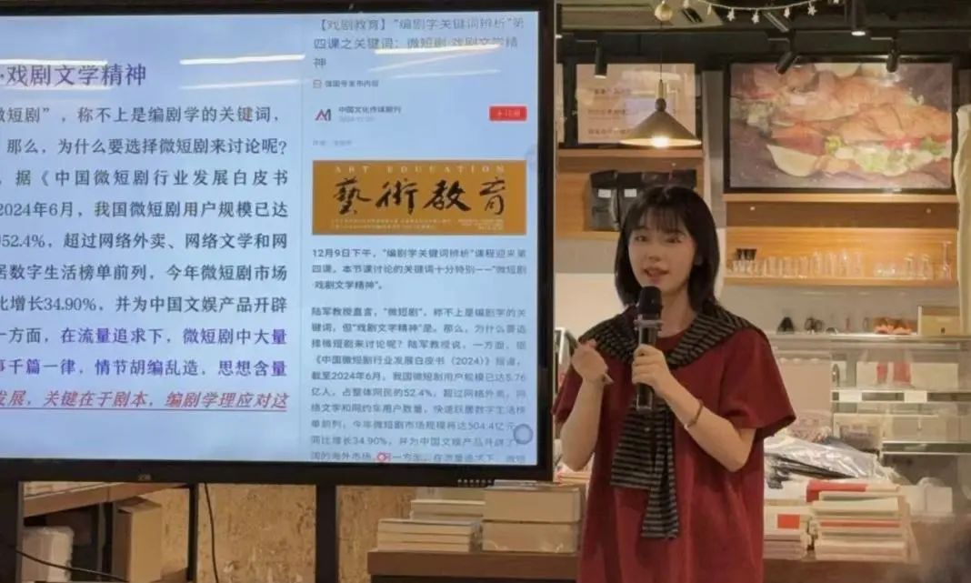 戏文系22级戏剧影视编剧MFA龙施宇分享了“短剧创作与文学精神”。她指出,微短剧虽然存在艺术格调不高、故事同质化等弊病,但是可以凭借传递价值观、洞察人性、多元题材创作实现突破,短剧的精品化仍需要文学精神的加入。她还结合了参与创作的《造浪少年》和筹备聚焦非遗女书文化等短剧案例,分享了自身在短剧领域的经验以及如何通过沉淀提升自我的竞争力。