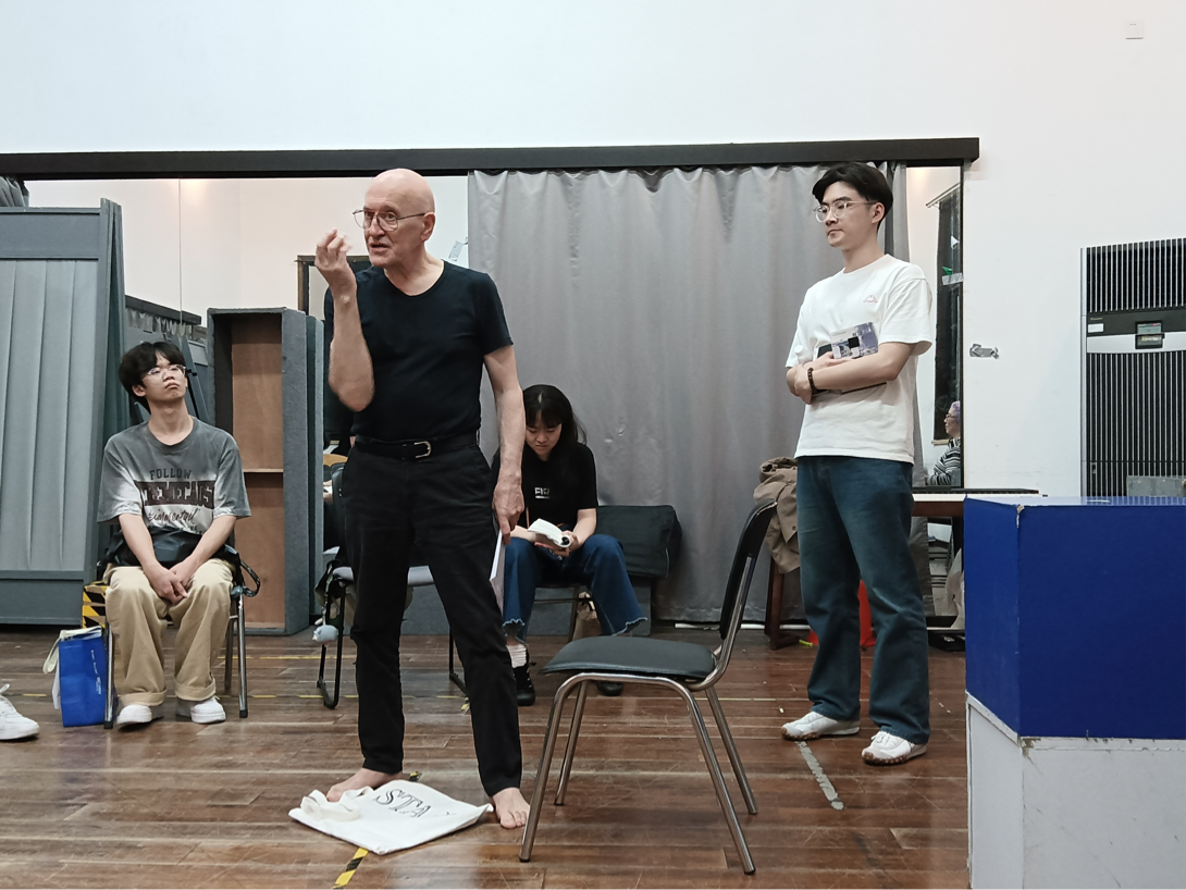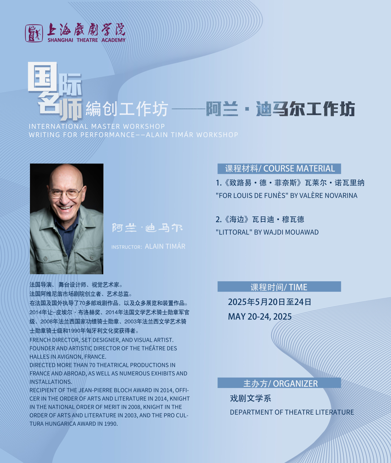 2025年5月20—24日,戏剧文学系“国际名师编创工作坊——阿兰•迪马尔工作坊”在上海戏剧学院华山路校区进行。阿兰•迪马尔(Alain Timar)是法国阿维尼翁市场剧院艺术总监和导演,在法国及国外执导了70多部戏剧作品与众多展览、装置作品,曾荣获法兰西文学艺术骑士勋章等荣誉。迪马尔导演早在2012年和2013年就曾两次来上戏先后与导演系和表演系合作,由其执导、表演系学生演出的《国王正在驾崩》一剧还曾在阿维尼翁戏剧节期间亮相,成为继《西厢记》之后上戏在阿维尼翁上演的第二部大戏。