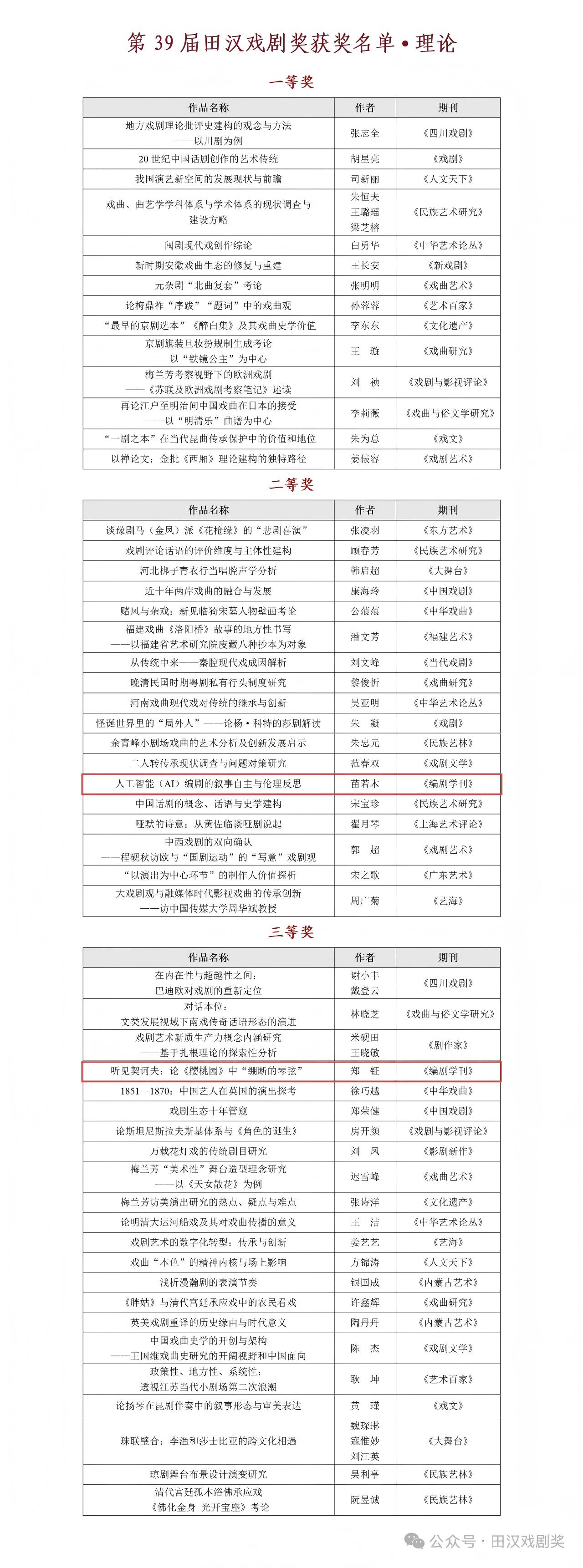 《编剧学刊》创办人、主编,我系陆军教授出席参评活动,本辑轮值主编、上海戏剧学院教务处副处长(主持工作)李世涛副教授代表学刊介绍报送的2部作品、3篇文章。最终,2部作品和3篇文章均斩获佳绩:话剧《嵇康之死》(编剧:肖留,导演:伊天夫,演出单位:上海戏剧学院)获得唯一优秀剧目奖,话剧《北京塔楼》(编剧:李宝群)获得剧本类一等奖。《如何让两个小时的独角戏变得更好看——以伦敦西区话剧<初步举证>为例》(作者:张欣桐)获得评论类一等奖,《人工智能(AI)编剧的叙事自主与伦理反思》(作者:苗若木)获得理论类二等奖,《听见契诃夫:论<樱桃园>中“绷断的琴弦”》(作者:郑钲)获得理论类三等奖。