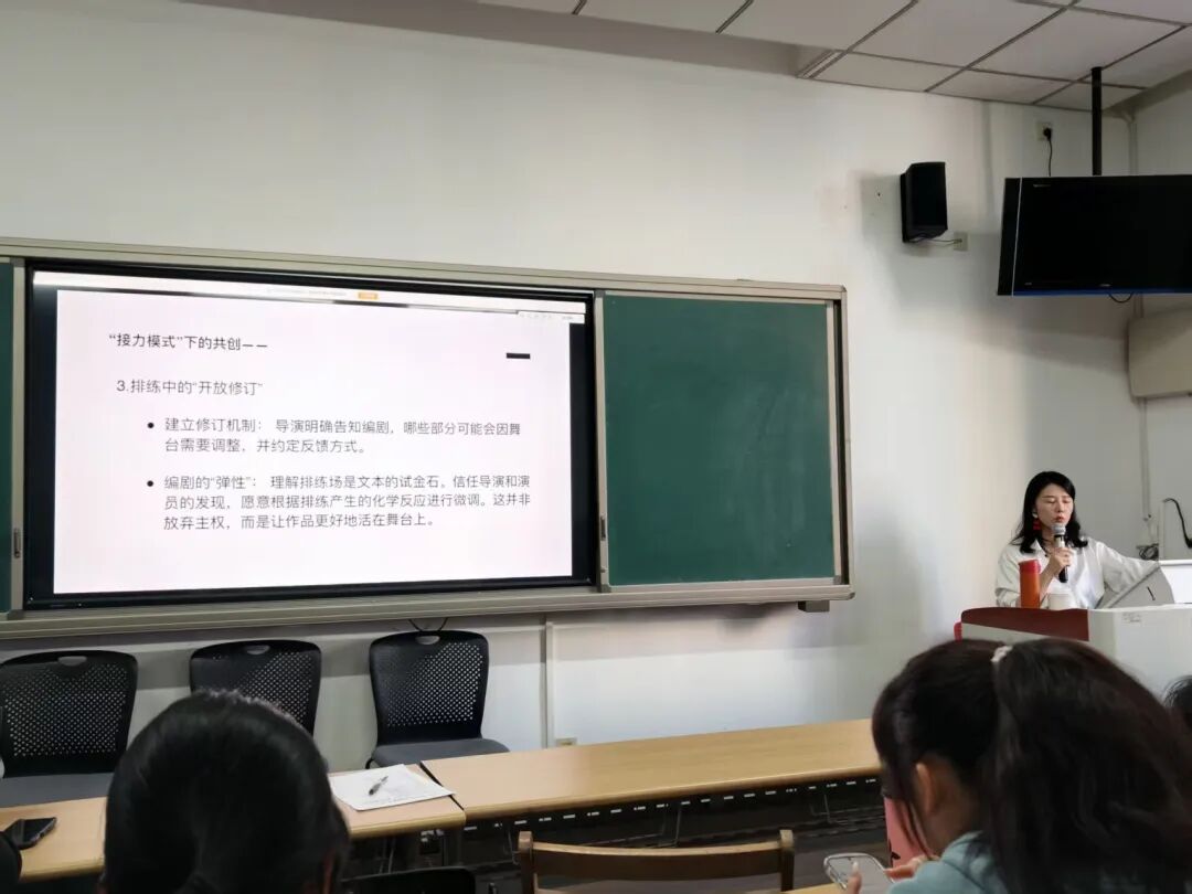 随后,查文渊老师就当下应用较为广泛的两种共创模式做了具体介绍。其一是接力模式,即由编剧先行完成剧本创作,再由导演开展执导工作。她指出,在接力模式下,编剧与导演应建立从剧本交付前至演出后的全周期对话机制,通过剧本围读、提问会、排练等步骤过程“弹性”修订,逐步达成编与导的总体协同。其二是编作模式,编剧与导演同步开展从文本到舞台的共创全过程,在确立某个方向或意象后采用模块工作法,即时编创、快速反馈,通过排演进行低成本试错,在流程循环中最终完成作品的锁定与深化。查文渊老师以其导演的作品《奔月》为例——该剧作为全球华语青年戏剧导演英才计划孵化剧目,曾入围北京新戏剧展演并助其斩获“壹戏剧大赏年度新锐导演”奖项——分享了作品在编作模式下的“成长”历程,大大开拓了同学们的艺术思维。