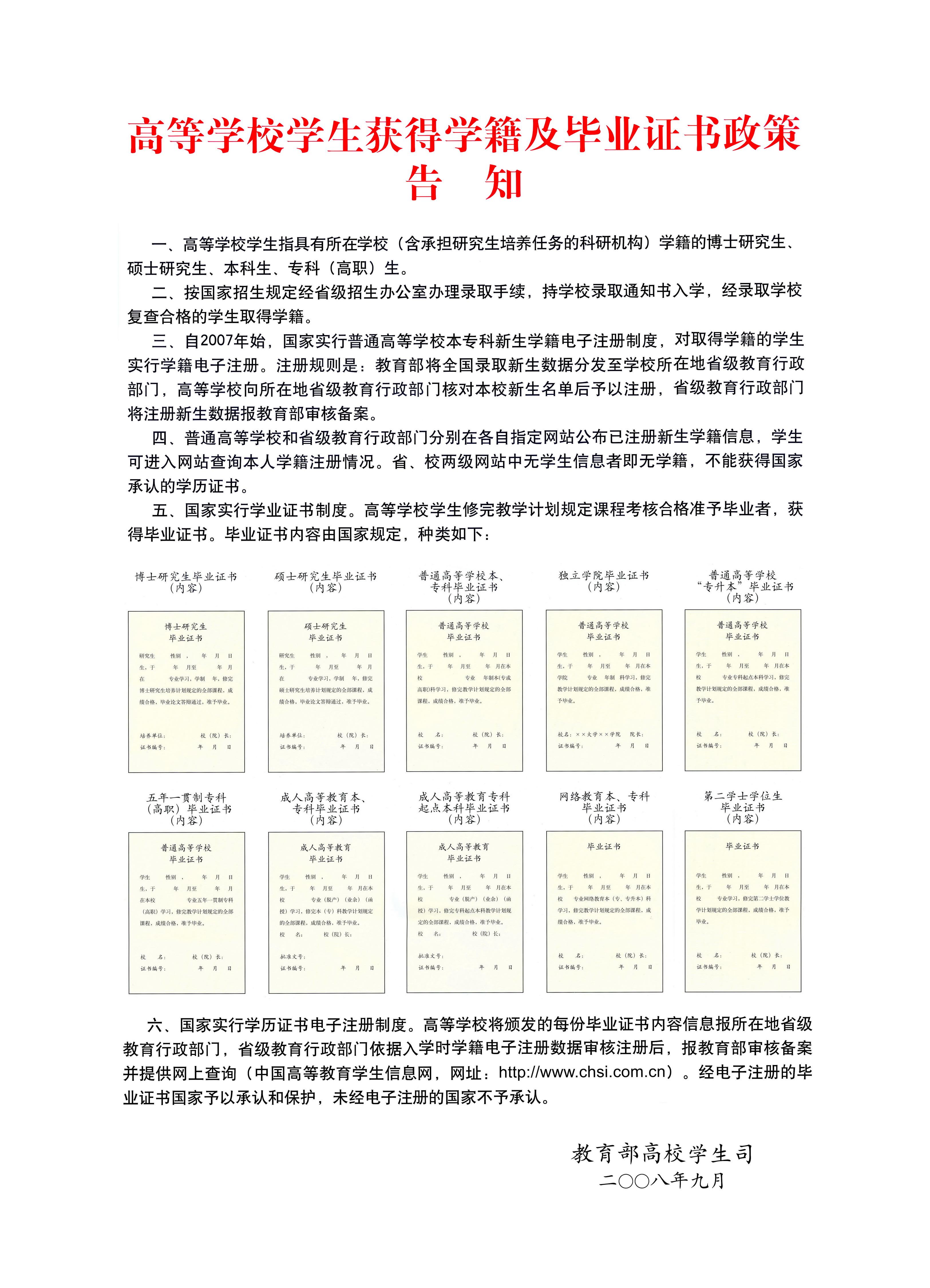 高校学生获得学籍及毕业证书政策告知