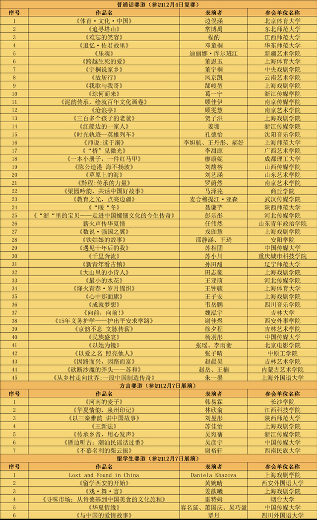 自2024年10月31日起,组委会多次组织评审专家召开研讨会,秉持公平、公正、严谨、规范的原则,从众多参赛作品中精心遴选出45件普通话赛道作品参加12月4日的线下复赛。经过复赛选拔,最终脱颖而出的20件作品将晋级至12月7日晚的决赛展演。同时,方言赛道的7件作品和留学生赛道的6件作品将直接进入线下决赛展演。以下为复赛入选作品名单(按姓氏首字母排序):