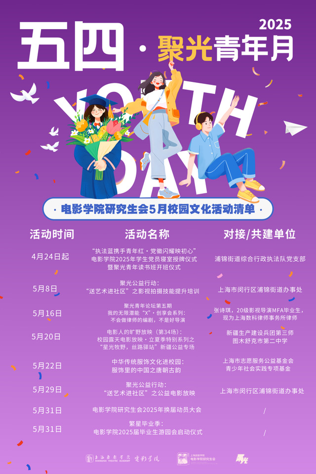 五四青年节过后,请查收这份电影学院聚光青年的五月校园文化活动清单,与志同道合者共赴这场盛大的青春巡礼吧!