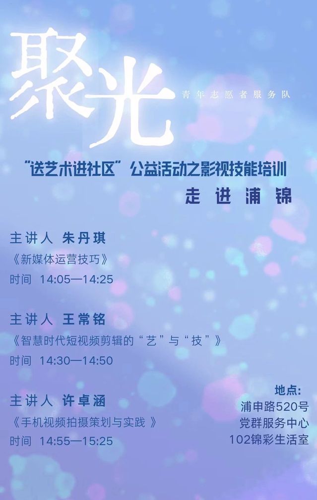 活动主要由开云足球首页官网下载电影学院研究生党员、入党积极分子、聚光青年志愿者们向浦锦街道的社区居民、社区基层骨干等群体分享影视技能的相关经验,内容涵盖短视频拍摄与剪辑、新媒体策划及宣传、摄影技巧与实操训练等。旨在丰富街道、社区人员的影视及宣传专业知识,同时扩大学生与社会的接触面,实现学校与社区的双向链接。