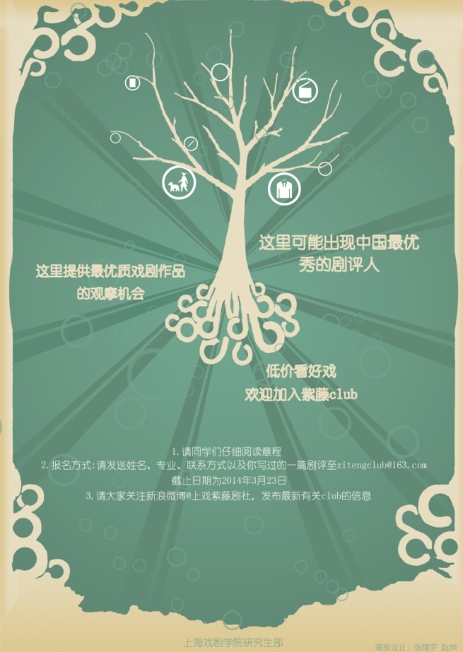 请大家关注新浪微博@上戏紫藤剧社,发布最新有关CLUB的信息。